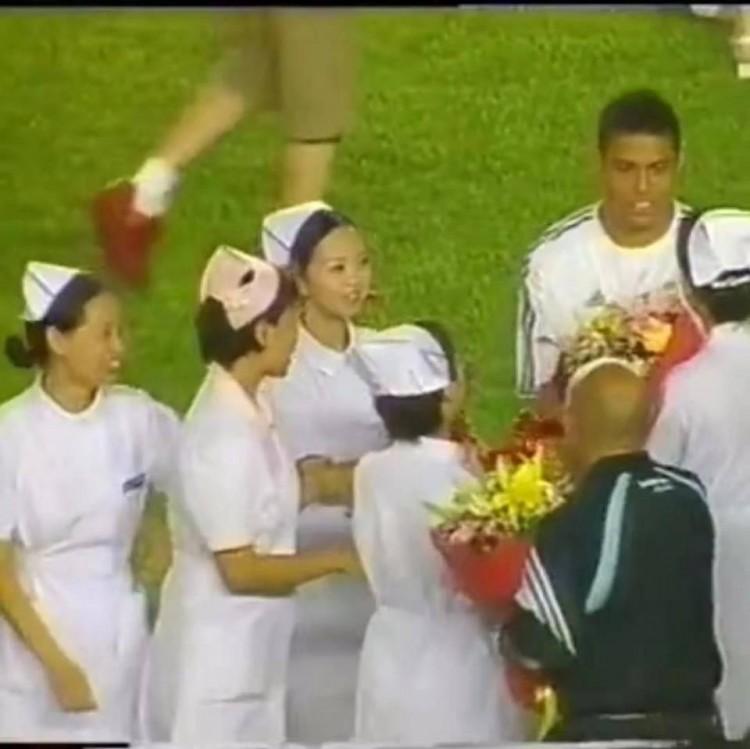 2003年工体“龙马大战”之夜,齐达内、罗纳尔多、菲戈、劳尔、贝克汉姆、卡洛斯六位白衣巨星与抗击非典的白衣天使们合影留念,纯洁美丽的白色关怀令中华大地如沐春风,一扫阴霾。