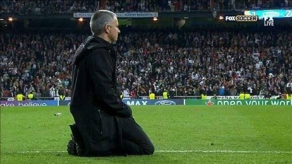 2011—2012赛季欧冠半决赛皇马与拜仁的次回合打到点球大战时,穆里尼奥双膝跪倒,祈祷上天的眷顾……