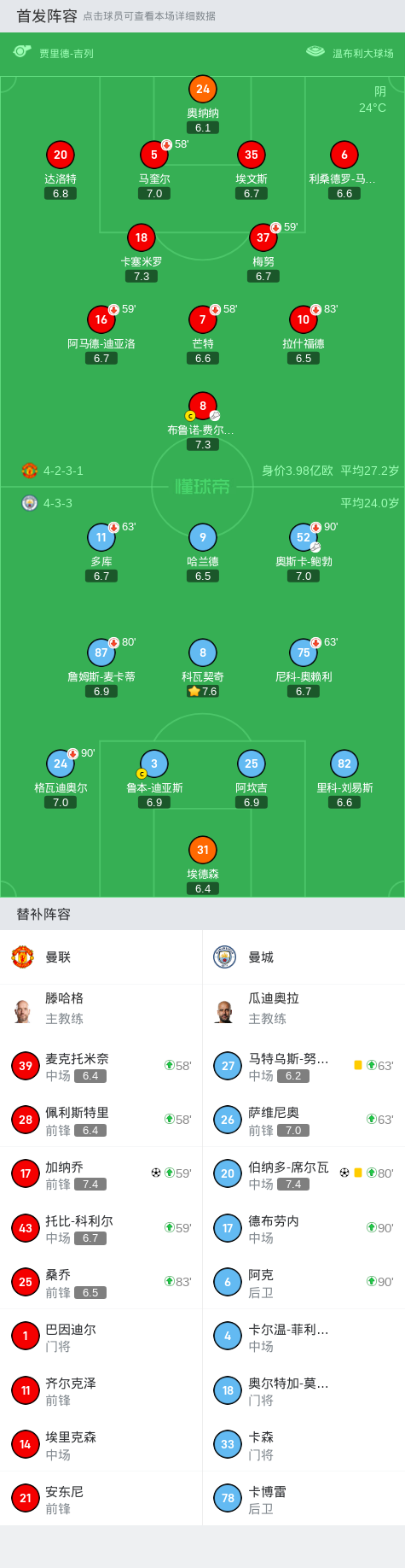 第58分钟,曼联连换四人,加纳乔、佩利斯特里、麦克托米奈、科利尔登场