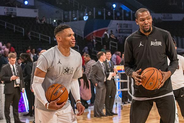 在今年的全明星赛上,威少也为杜兰特送出了一记长传。当杜兰特轻松地将球放进篮筐,然后手指指向威少时,时光仿佛被拉回了“杜威二少”的雷霆时代。