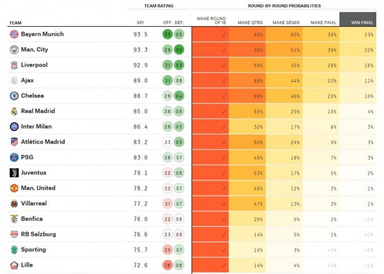 拜仁以23%的概率位列第一,曼城22%紧随其后,利物浦排名第三,即将上演强强对话的皇马和巴黎则分别排在第6和第9,曼联第11。
