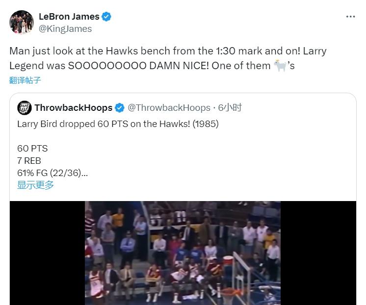 直播吧06月07日讯 詹姆斯更新个人社交媒体,晒出一段凯尔特人名宿拉里-伯德的集锦。