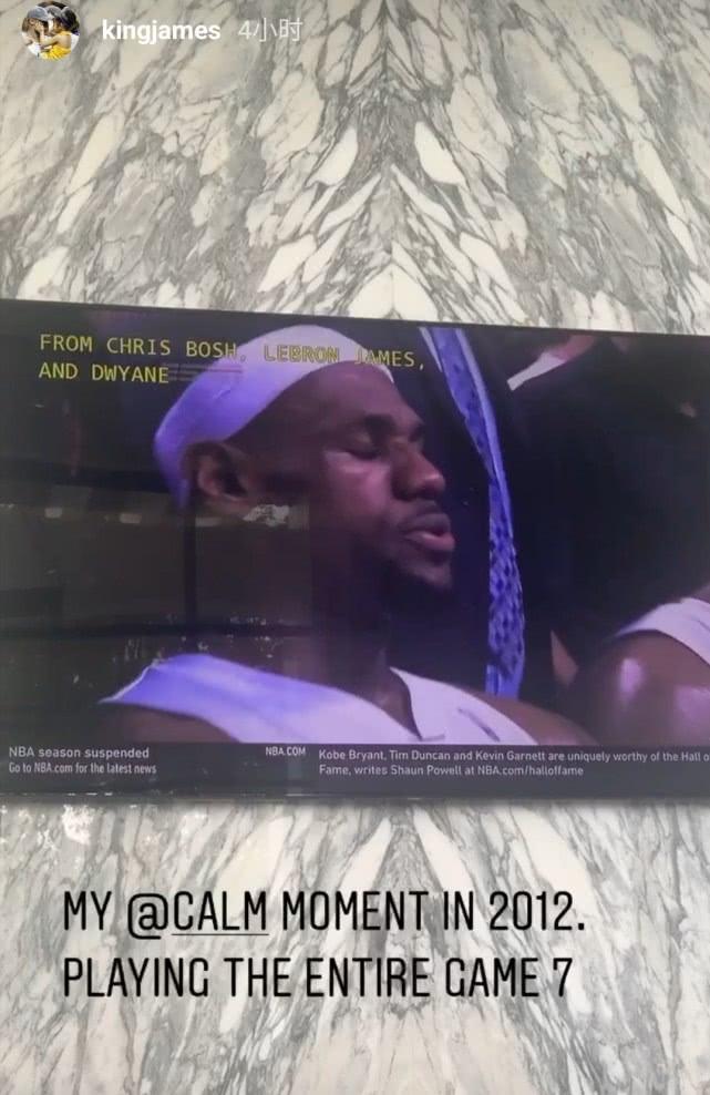 詹姆斯还列出了一些相关的数据,比如热火三巨头包办了这场比赛的最后25分。他还晒出了自己在替补席上深呼吸的镜头,并配文道:“我在2012年的平静时刻,第七战打满全场!”