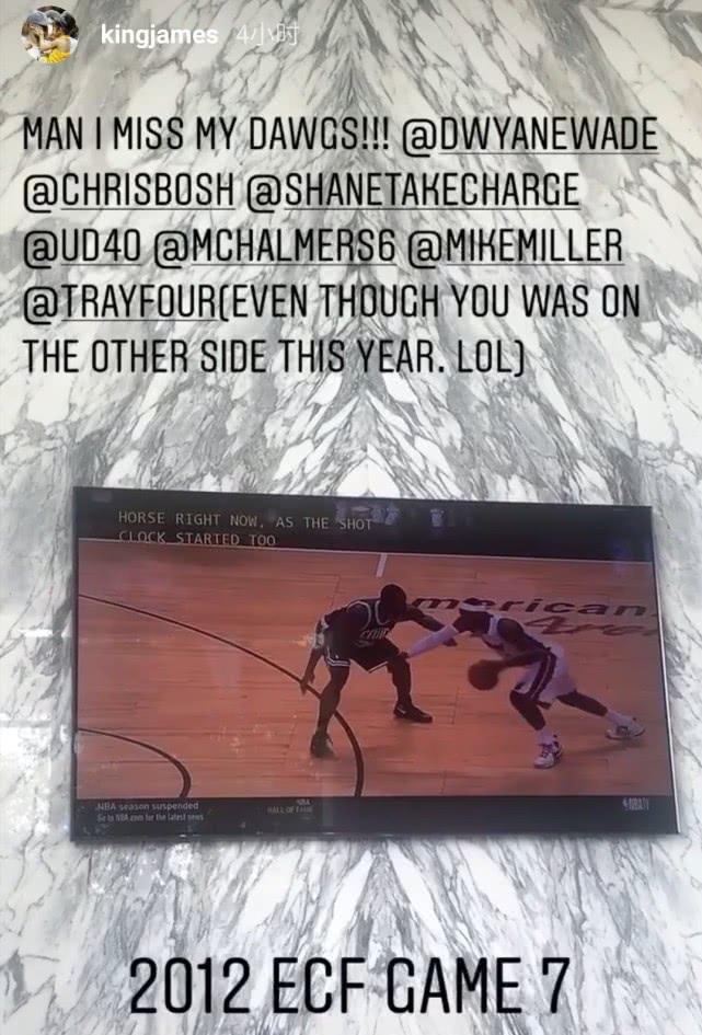北京时间4月6日,湖人球星勒布朗-詹姆斯在家中观看了2012年东部决赛第七战的录像,并连续更新七条相关的动态。这位35岁的全明星,表示自己很想念昔日的队友。