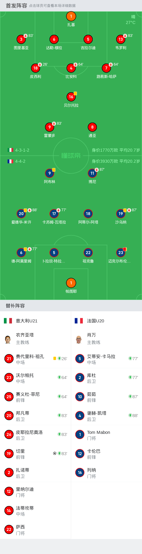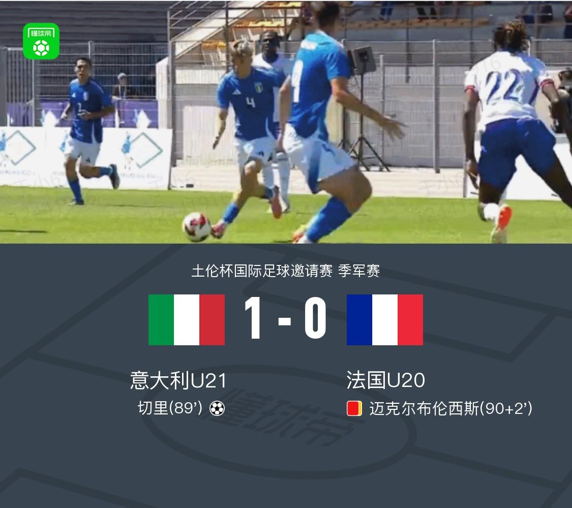 在土伦杯国际足球邀请赛季军赛中,意大利U21迎战法国U20。上半场,图里基亚抽射被扑,沙乌纳任意球攻门被门将没收。下半场,祖孔远射打偏,沃尔帕托助攻切里绝杀,迈克尔布伦西斯累积两黄被罚下,最终,U21意大利1-0绝杀法国U20夺土伦杯季军。
