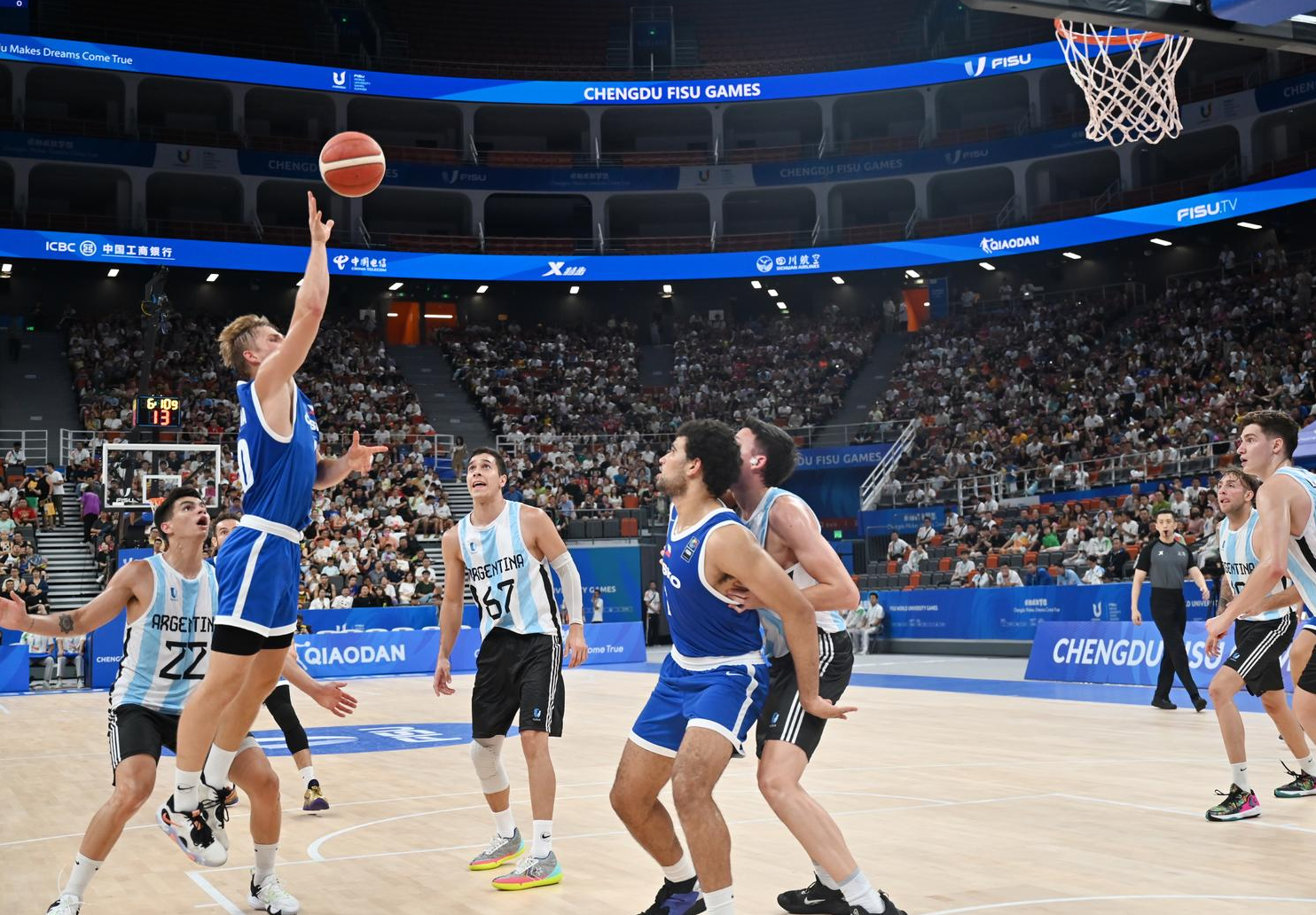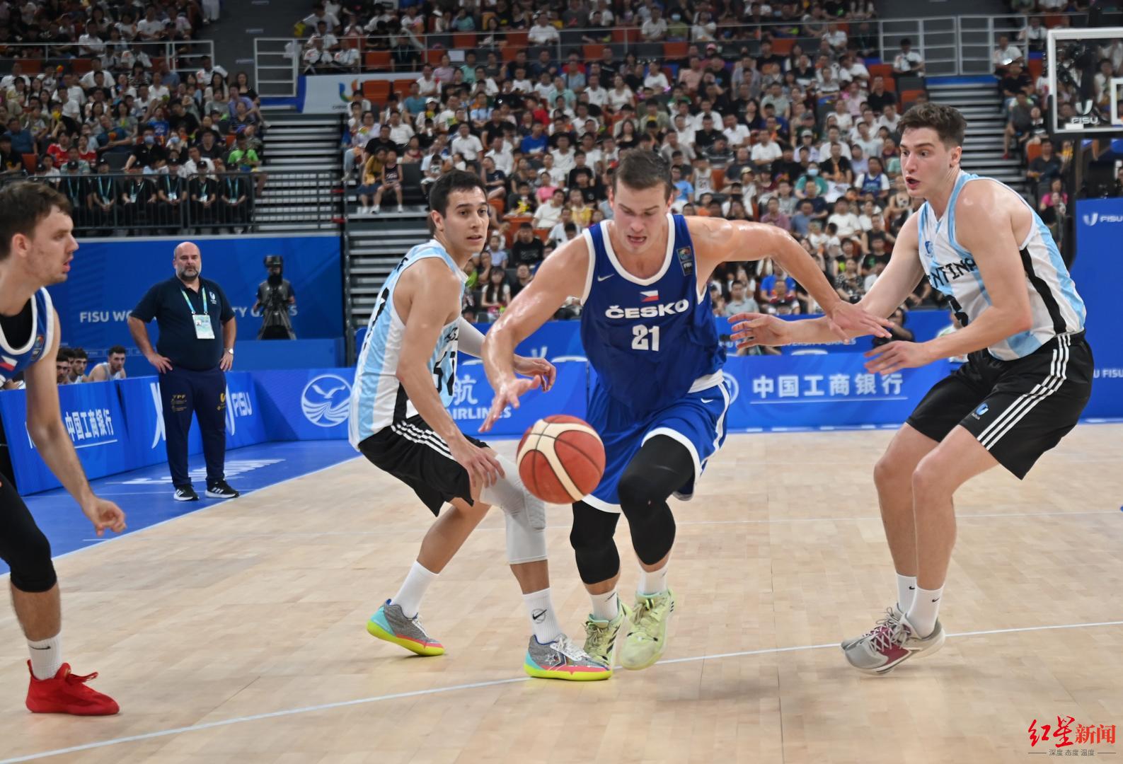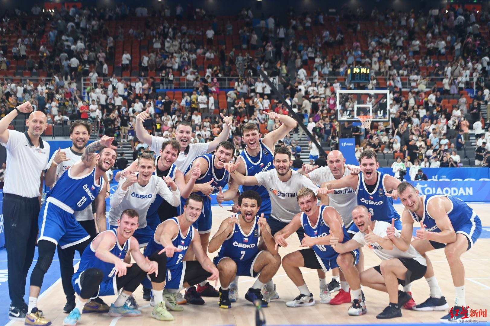 8月4日晚,成都大运会男篮第二场半决赛在凤凰山体育公园冰篮球馆举行,最终阿根廷队以68比85不敌捷克队,后者将在决赛中对阵巴西队。赛后,捷克队员在场上庆祝比赛的胜利,久久不肯离开。一名捷克球员告诉记者,他们作为一匹“黑马”闯进决赛,离不开现场观众的加油支持。