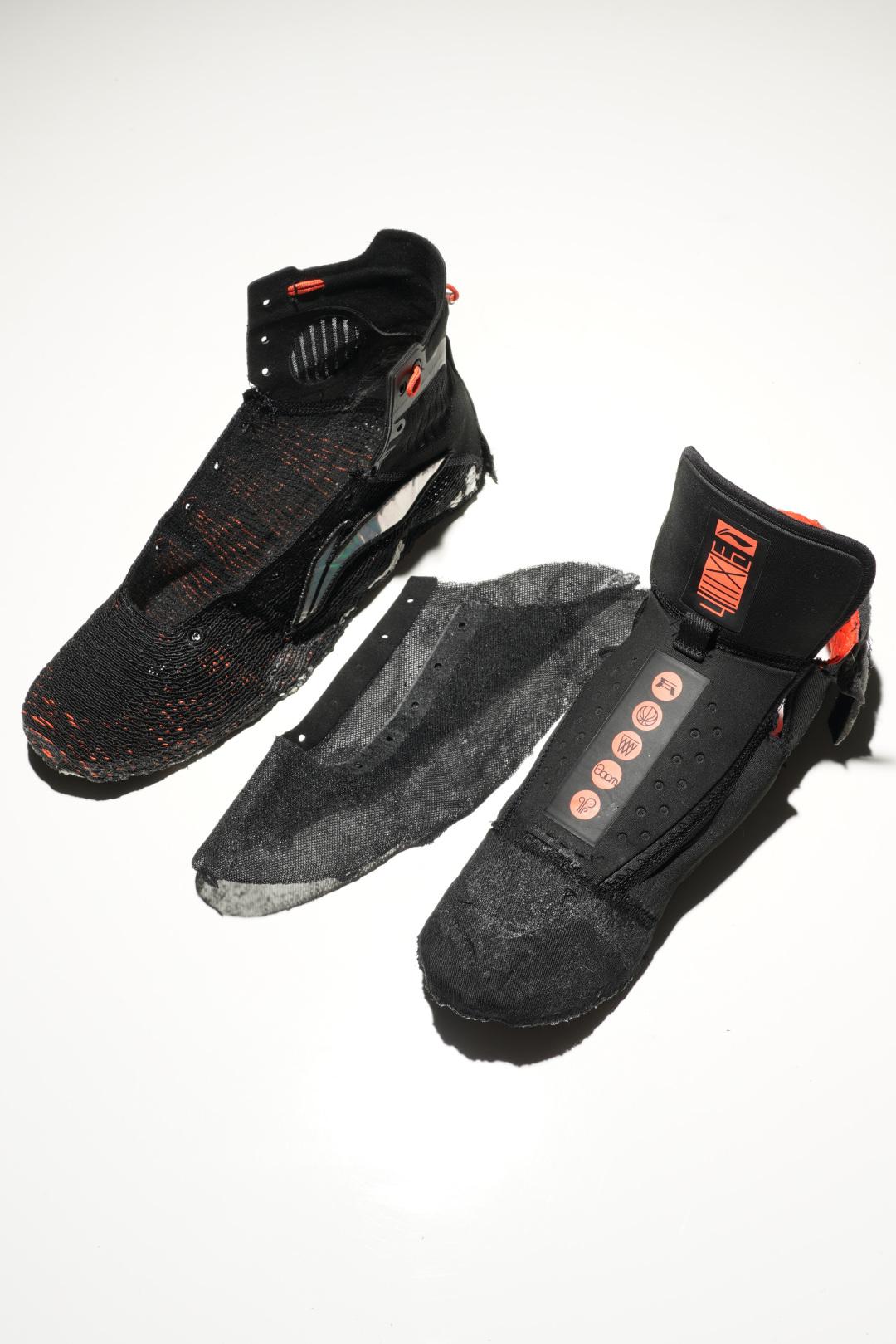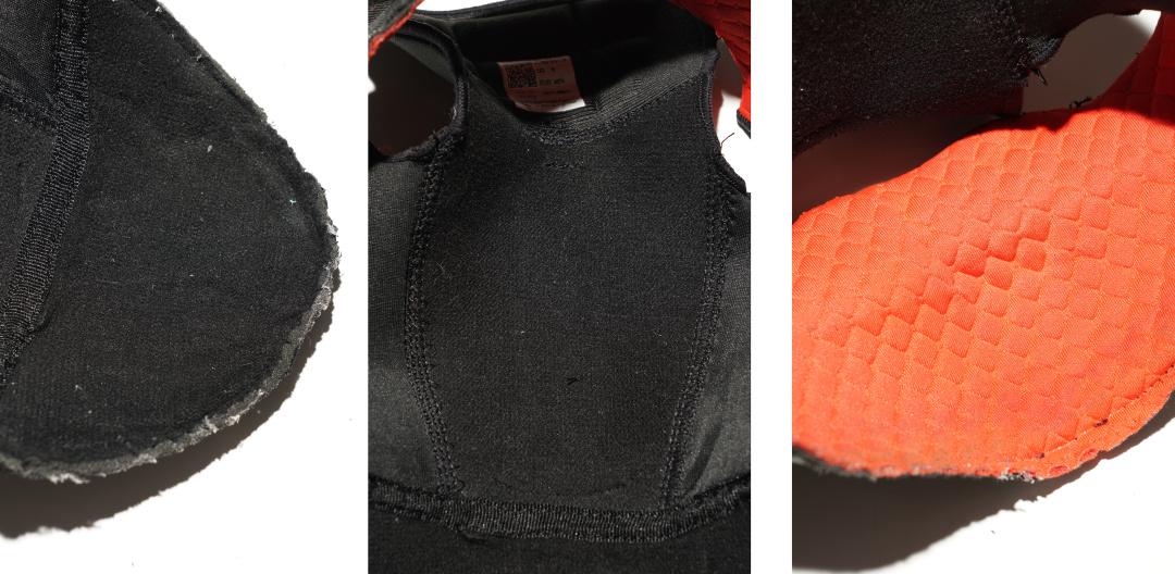 拆解下来,鞋面结构分为三层,最外层高强度编织鞋面,夹层尼龙网面,内层为高舒适度、分区域的薄海绵填充内衬。