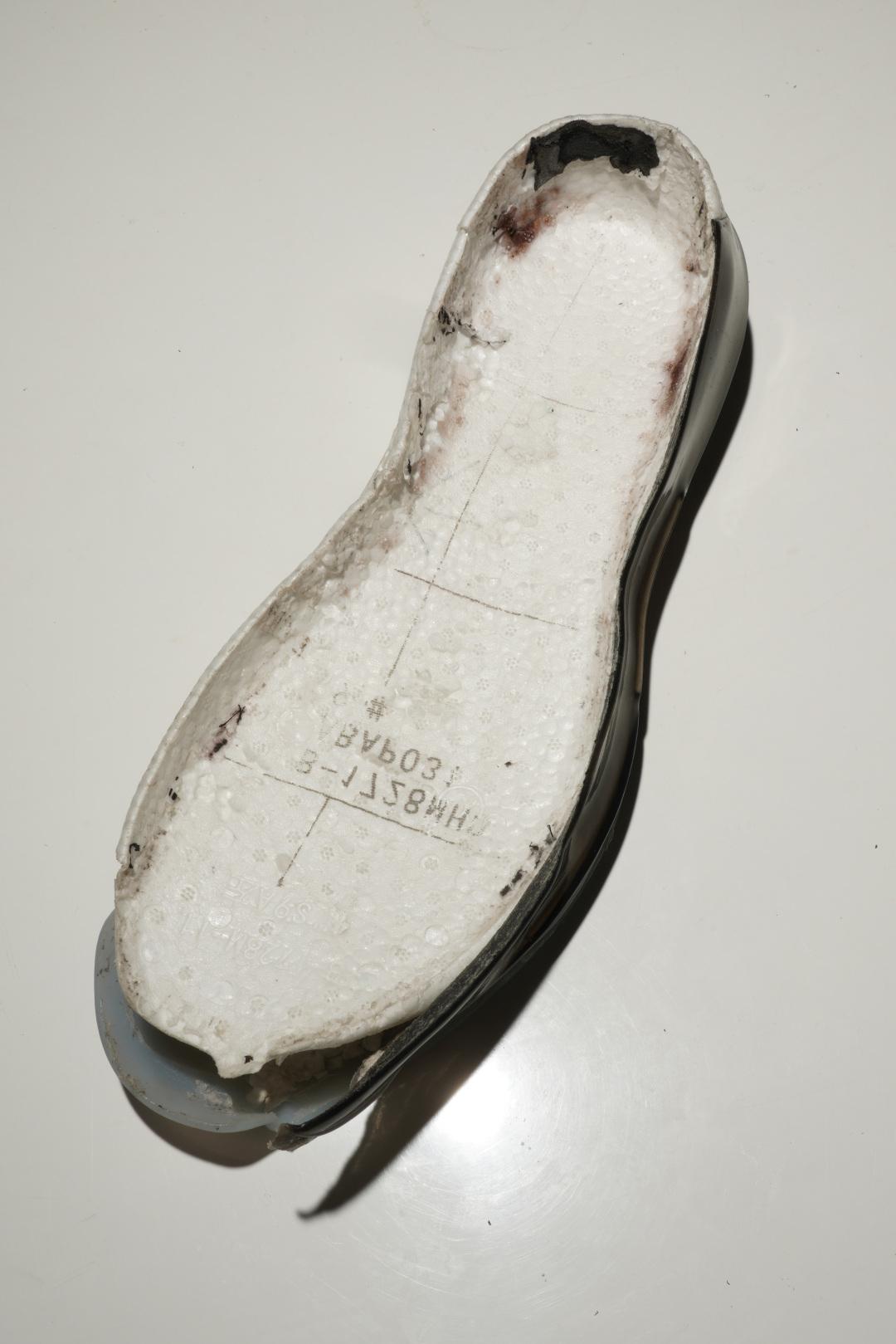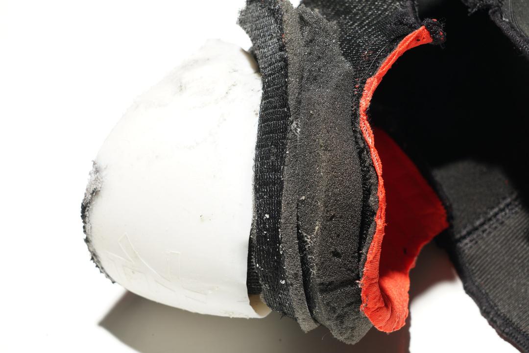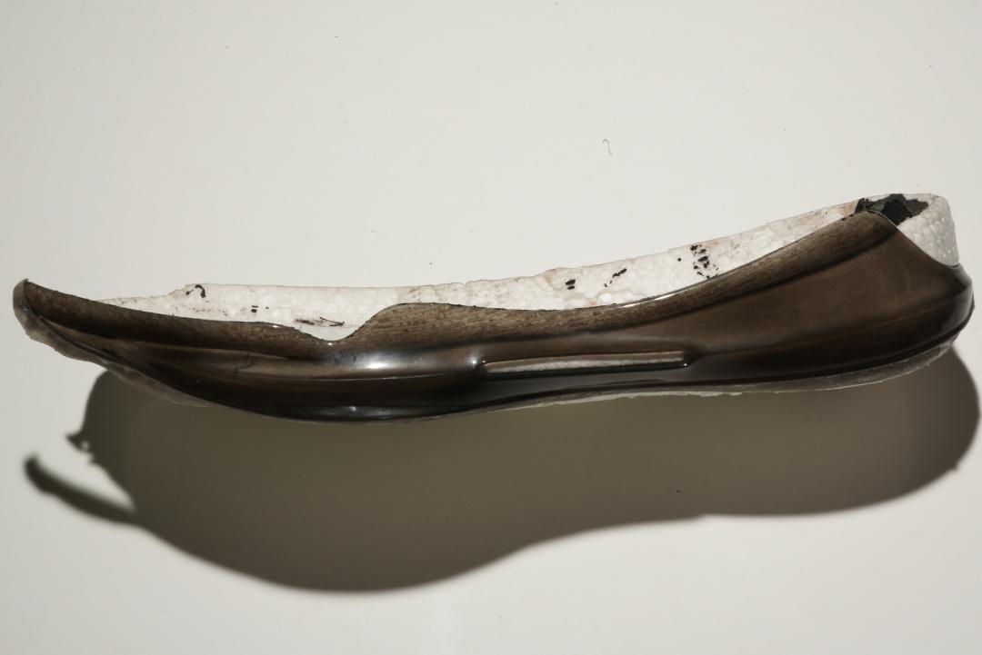分离时剥离下来非常多的Pebax材料。外底橡胶硬度为62HA,耐磨测试3处,0.5h,均值15.28mm,非常不耐磨的水准。