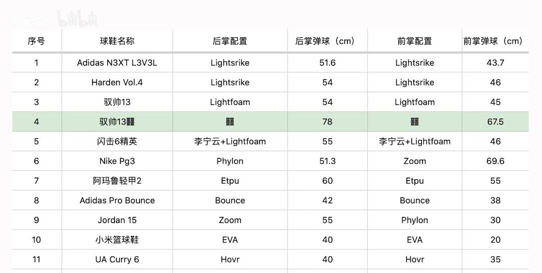 驭帅13䨻采用全掌Pebax材料发泡制成,关于他的性能方面,大家可以结合各大球鞋测评参考一下,其中极客鞋谈的长测报告里面,也列出了䨻的回弹指数: