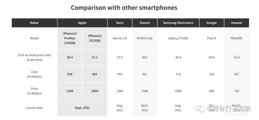 随着设备变得越来越复杂,智能手机内部组件的总成本已经上升。iPhone 13 Pro Max 36.5%的成本占比相对较低,低于三星的39.4%、华为的51.0%和谷歌的44.9%,表明苹果的盈利能力严重依赖品牌实力。