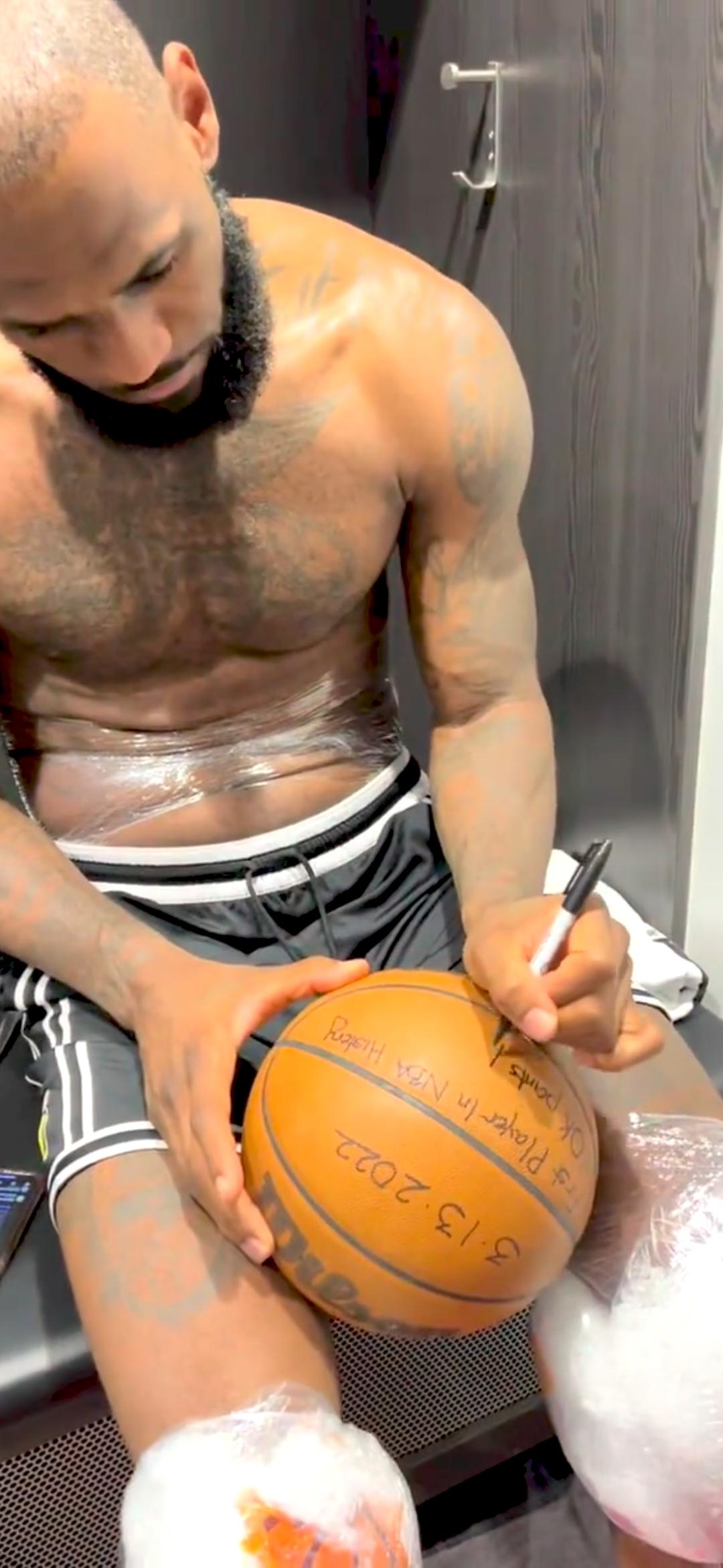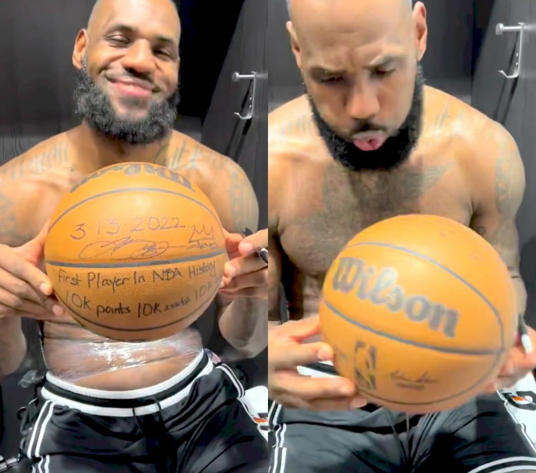 在赛后詹姆斯拿走了该场比赛的用球并签名作为纪念。詹姆斯今日在其个人社媒晒出了该比赛用球,可以看到詹姆斯在球上写下了,2022年3月13日、 ?、詹姆斯签名、“历史首位3万分+1万篮板+1万助攻球员”等文字。