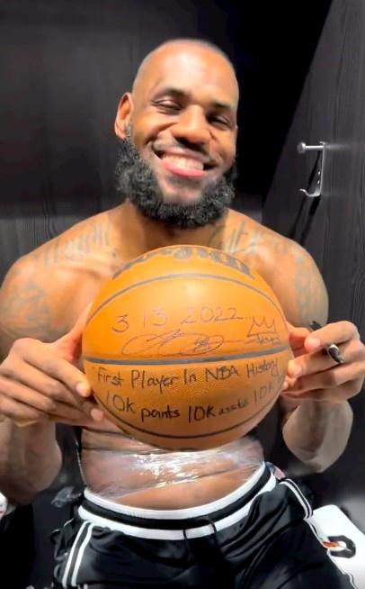 写到最后,詹姆斯非常仔细地捧起这个签名球,用嘴吹了吹,然后拿着球咧嘴笑了。这个签名球上写着:“2022.3.13 (詹姆斯的签名+皇冠符号),NBA历史上第一个拿到10K分+10K篮板+10K助攻的球员”