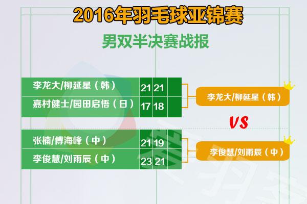 在男双德比之战中,张楠/傅海峰0-2(21-23、19-21)惜败给队友李俊慧/刘雨辰。另外一对韩国强档李龙大/柳延星2-0战胜日本组合嘉村健士/园田启悟杀入决赛。
