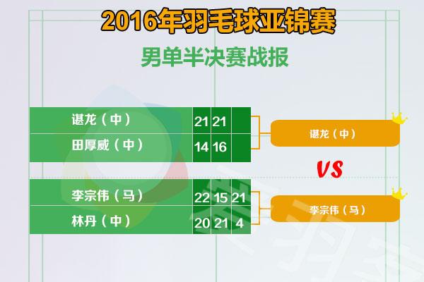在备受关注的第36次林李大战中,林丹1-2(20-22、21-15、4-21)不敌李宗伟,创下林李对决最大分差,追平了个人职业生涯历史最低分(2016大马赛对阵约根森决胜局4-21惨败)。谌龙则轻松战胜队友田厚威晋级决赛,男单决赛将在谌龙和李宗伟之间进行。
