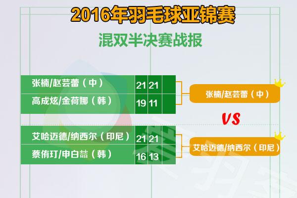 在混双半决赛中,头号种子张楠/赵芸蕾2-0(21-19、21-11)战胜4号种子韩国高成炫/金荷娜,两人将在决赛遭遇印尼组合艾哈迈德/纳西尔。