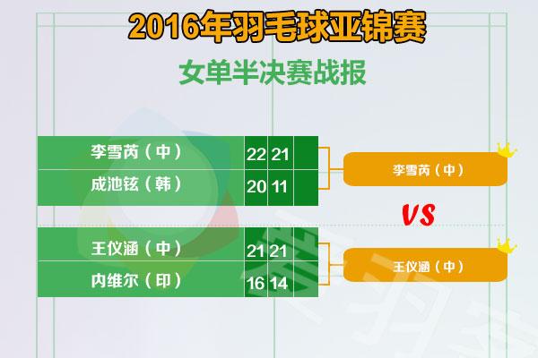 在女单半决赛中,李雪芮22-20、21-11战胜成池铉。王仪涵2-0(21-16、21-14)战胜内维尔,两人成功会师决赛。