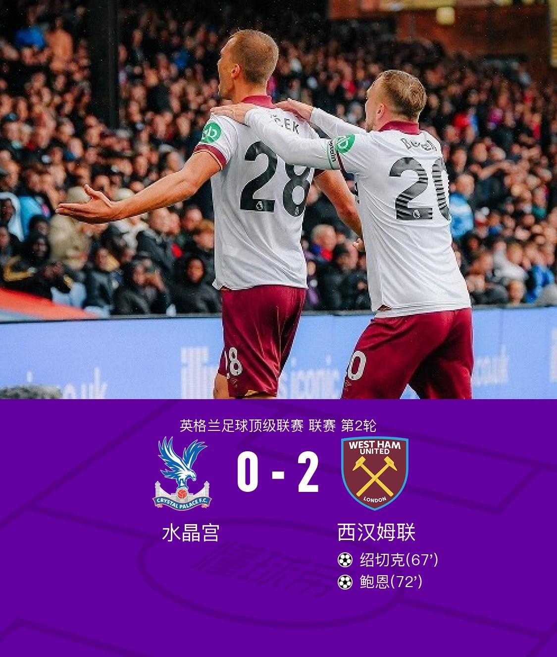 在英格兰足球顶级联赛第2轮的比赛中,水晶宫坐镇主场迎战西汉姆联。上半场库杜斯爆射打偏,埃泽禁区低射被扑,爱德华单刀打偏,埃泽抽射中框,下半场绍切克乱战破门,鲍恩内切爆射扩大比分。最终,西汉姆联以2比0战胜水晶宫,取得了宝贵的胜利。