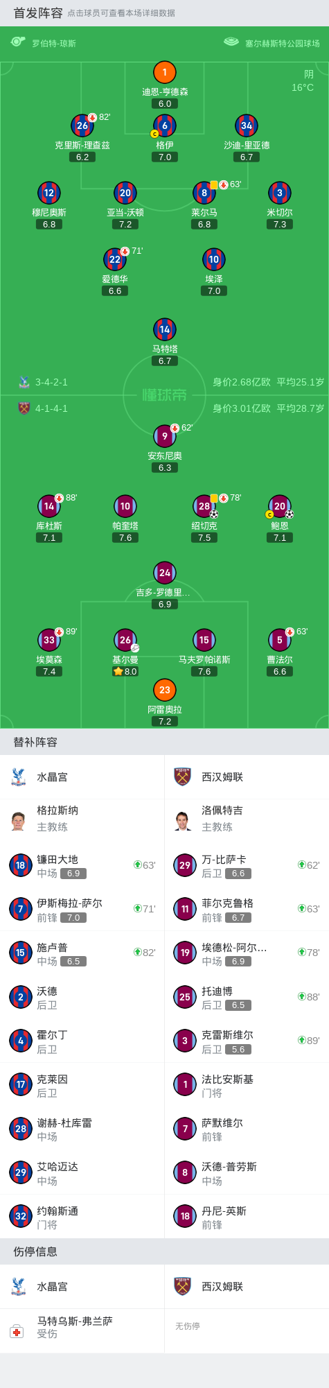 水晶宫vs西汉姆联 是什么时候?水晶宫与西汉姆联的比赛是在2021年8月28日举行的。这场比赛是在英格兰伦敦的塞尔赫斯特公园球场进行的,是英超联赛的一场激烈对决。双方球队展开了激烈的较量,...