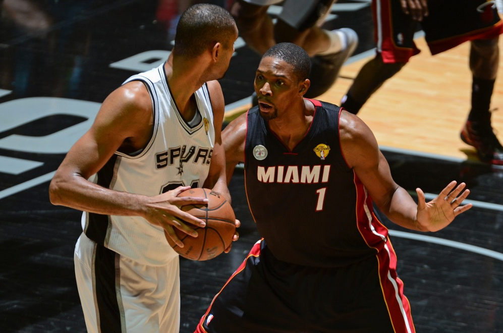 14年的那支热火队,依旧是三巨头为班底,詹姆斯29岁正值巅峰,韦德31岁处于巅峰尾巴,波什30岁也是正值当打之年。早在13年的时候,波什就被老邓肯打爆了,所以14年他也是没占到便宜,系列赛5场波什场均14分5.2篮板1助攻,投篮命中率是54%。对比常规赛场均16+7的数据,波什的表现有所回落。而38岁的邓肯在他头上砍下了场均15.4分10篮板2助攻的数据,投篮命中率57%,对位又是邓肯完胜。