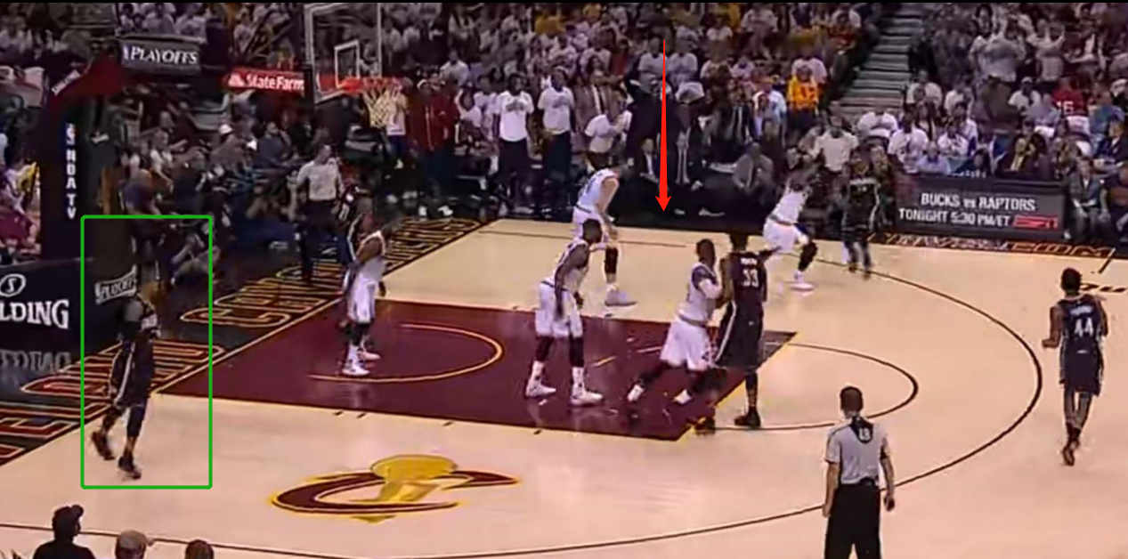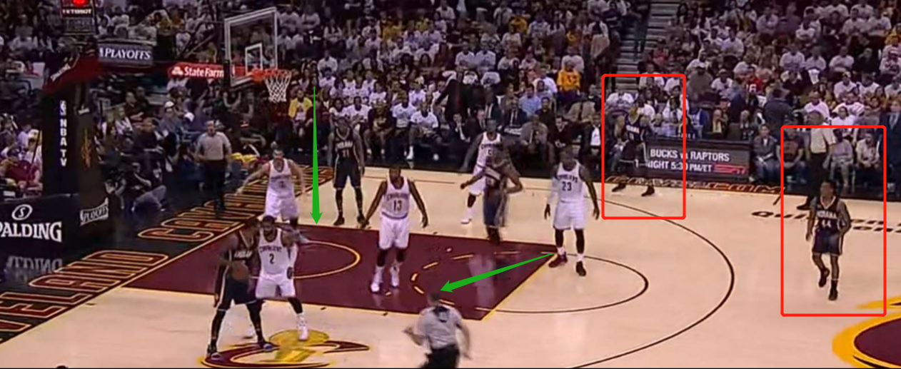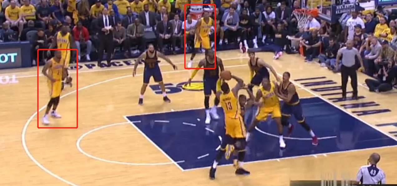 依旧以一个战术回合来分析,强侧位置乔治持球准备进攻。蒙塔埃利斯是从强侧在向弱侧移动,他希望可以为乔治拉开进攻的空间。但是我们看防守蒙塔埃利斯的球员居然没有跟着他移动,而是留在了原来的防守位置随时准备协防乔治,这成为了乔治无法轻松得分的原因。自己的队友是在拼尽全力的想要为乔治创造更多的空间和得分机会,但是骑士队完全不去理会其他球员的跑位,所有的防守注意力都在乔治的身上。步行者队的其他人没有能够改变骑士队的防守策略,在乔治不信任队友的情况之下,只能选择自己单打。而在这轮系列赛之中,其实的防守策略很好的限制了乔治的进攻: