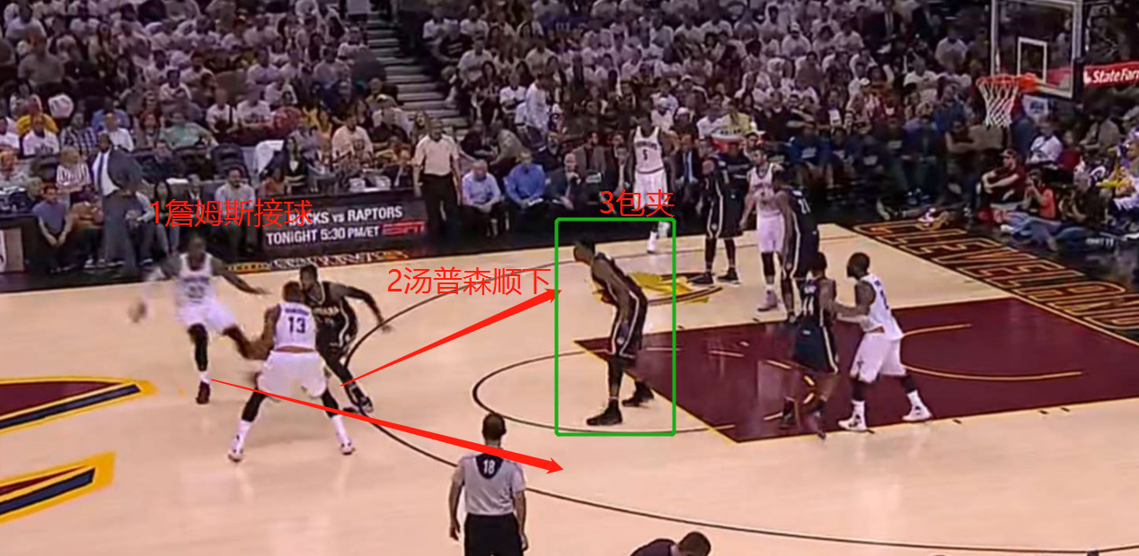 上图这个防守,汤普森在高位给詹姆斯做了一个挡拆。我们看特纳的位置,站得非常低,这是可以理解的,因为汤普森没有远投能力,他更需要注意的是詹姆斯的突破,所以这个站位没有什么太大的问题。但是对于乔治来说压力就非常大了,如果不能挤过挡拆,詹姆斯就会获得空间组织下面的进攻。而乔治为了留住防守空间选择绕过的方式,这时候汤普森可以进行顺下来继续这个进攻,但是这个时候特纳犯错了,他突然上提想要包夹詹姆斯,很明显是低估了詹姆斯的传球能力,最后詹姆斯一记妙传助攻汤普森完成空中接力。