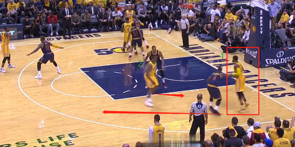 乔治单干难度逐渐增大的主要原因,就是骑士队的防守有自己的特点,也针对乔治的进攻做了很多的改变,我们通过几个战术简单来分析一下。