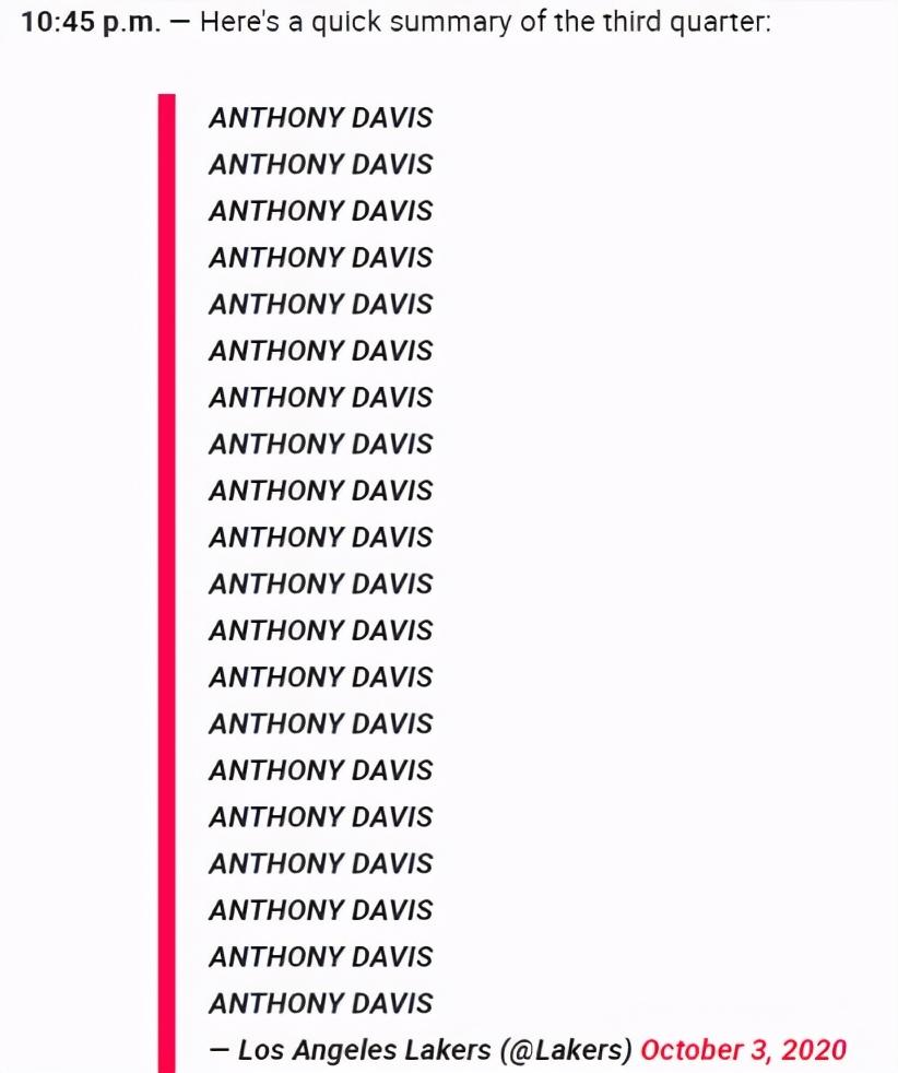 戴维斯在总决赛第一场得到34分9个篮板5次助攻,第二场32分14个篮板,而且他的命中率达到惊人的20投15中,尤其前13次投篮命中12球,完全无法阻挡。可以看一下第三节湖人队推特上面发布的信息,没有别的就是安东尼戴维斯。