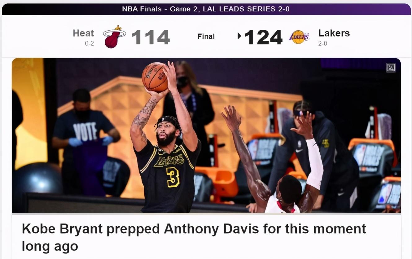 火湖总决第二场,湖人以124比111又一次获胜,系列赛2比0领先。比赛中AD得到32分14个篮板,詹皇得到33分9次助攻9个篮板,完全统治了比赛。看看ESPN的置顶标题:“科比早就知道AD会像这场比赛一样爆发”。我科,我心永恒。。。
