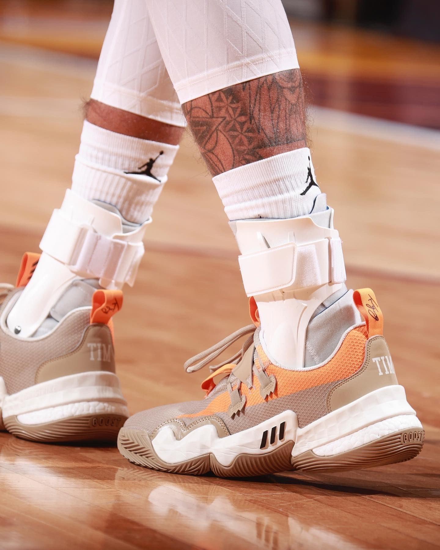 特雷杨穿的是自己的初代签名鞋,配色方面感觉和匹克的有点相似,都比较低调,鞋面用棕色填充,细节加入橙色点缀,后跟位置还有字母加持,这个配色狗哥觉得不如“全明星”的黑紫色,大家怎么看呢?