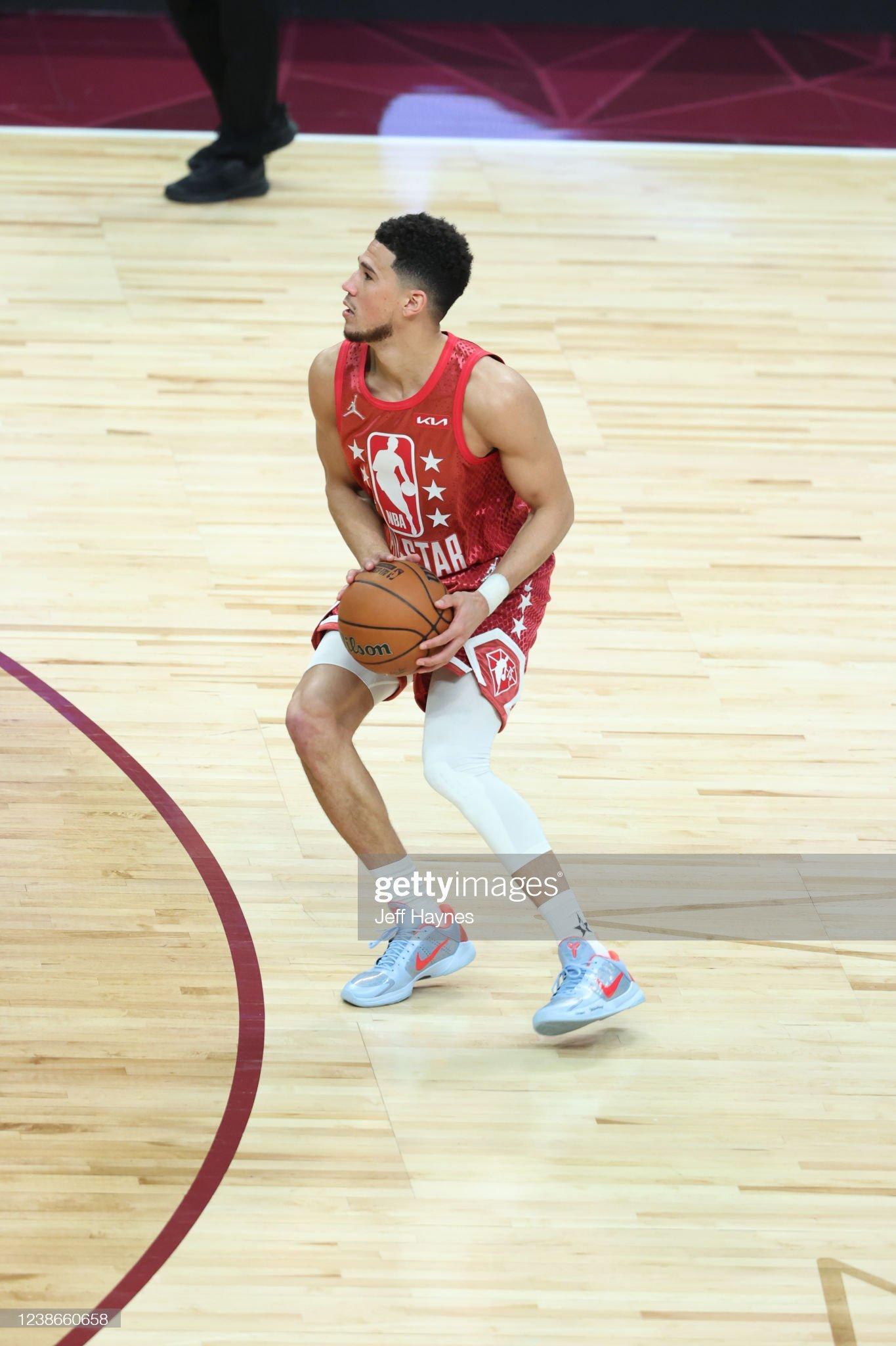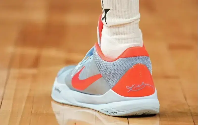 同样是科比门徒的布克,他选择的也是科比的签名鞋,他穿了一双 Kobe 5 Protro ,灰色鞋面配合橙色点缀,属于他的专属PE,有点太阳队配色的感觉。