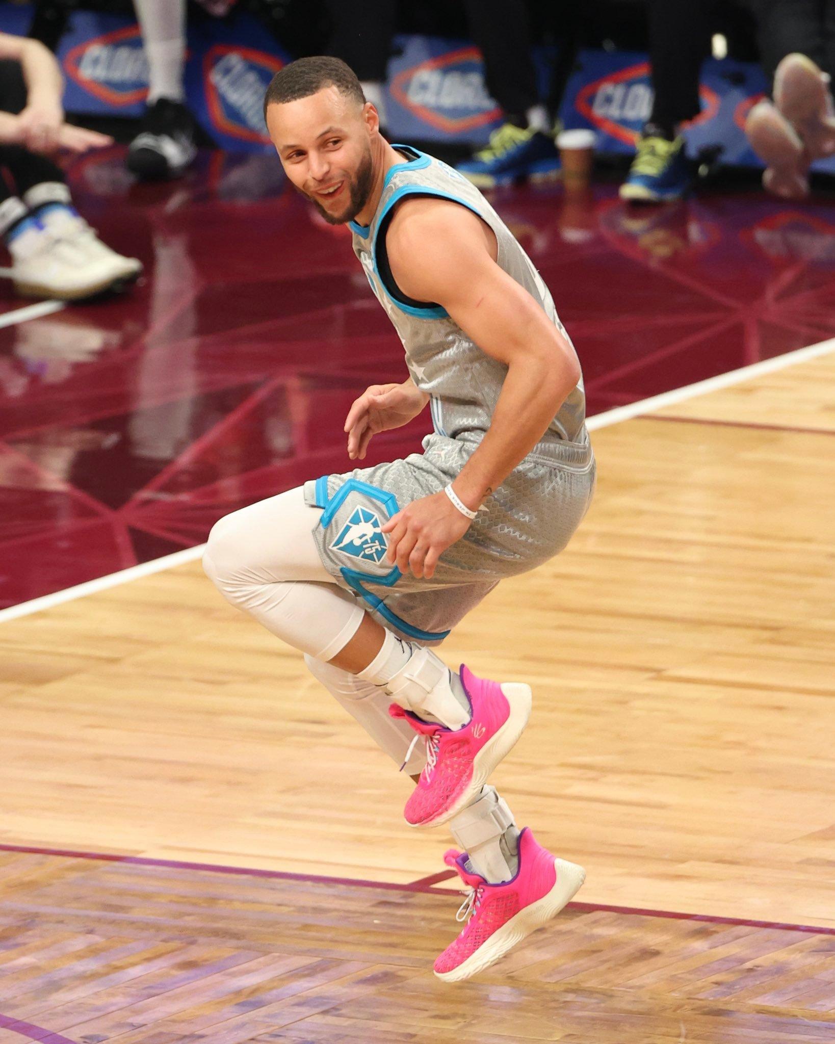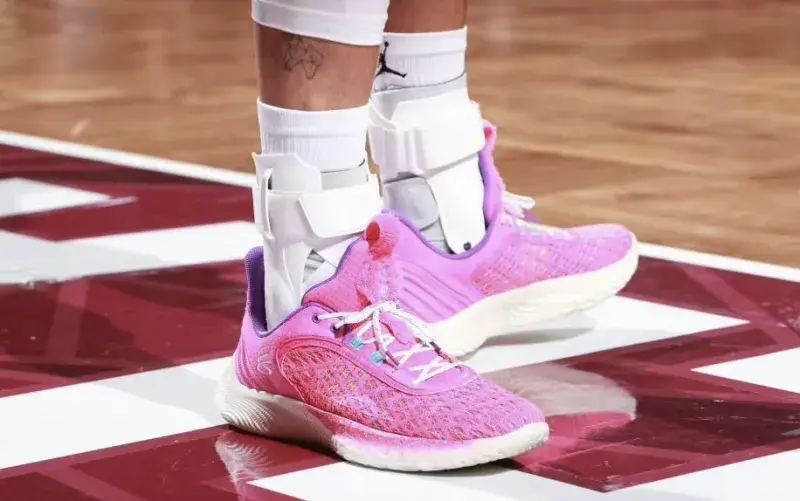 本场比赛的MVP,库里穿的自己的第九代签名鞋,亮粉色的鞋面搭配淡黄色的中底,就一个字:靓!库里牛了这么多年,还能保持状态,真的厉害,UA要是没有他,真的不行,前几年完全是球星带品牌,希望今后UA多多展现自己的实力吧。