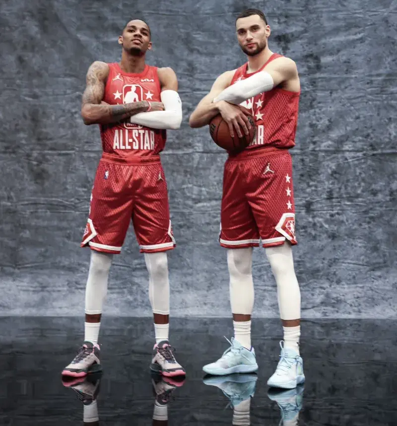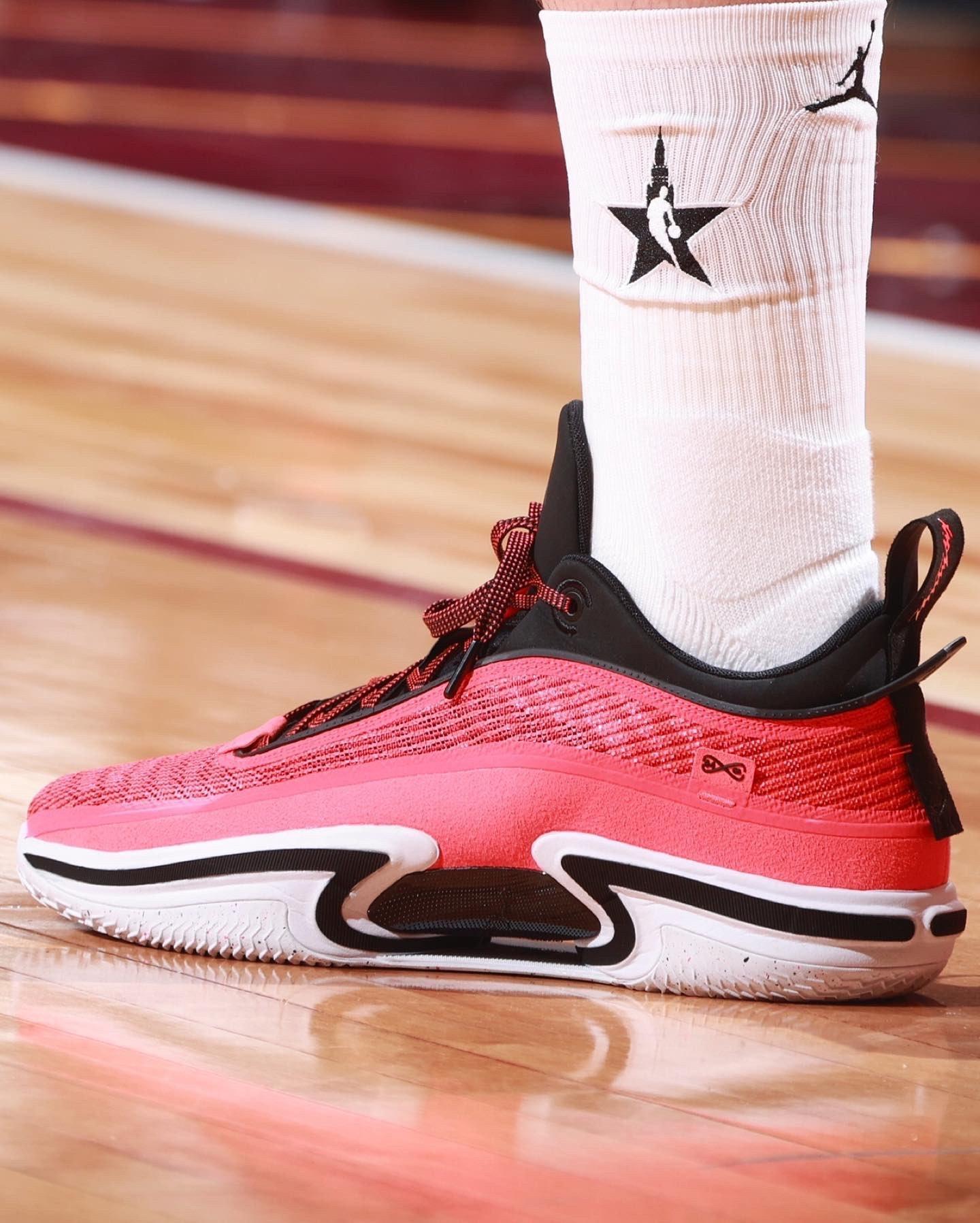 东契奇肉眼可见的瘦了,他穿的是 Air Jordan 36 Low ,配色比较普通了,红色鞋面配合黑色的鞋舌,加入白色的中底、外底,颜值好普通,如果配色方案稍微改一下,狗哥觉得会更好一些,常规赛东契奇表现太出色了,全明星赛也就打个酱油了。