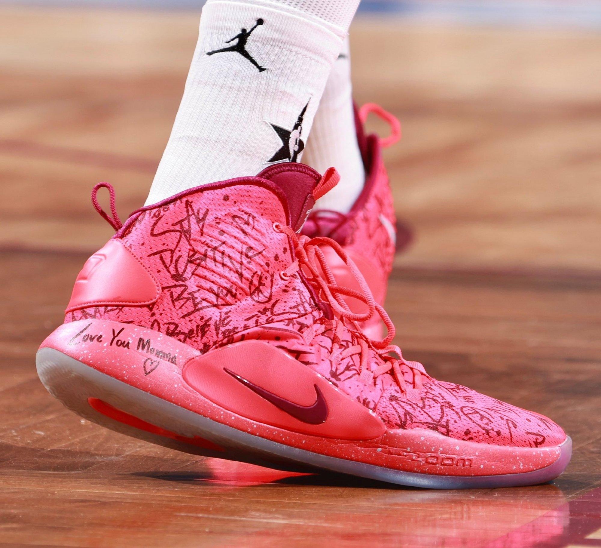 唐斯穿的还是Nike Hyperdunk X 这双鞋,和参加三分大战时候的款式一样,平时比赛的时候他就穿这双鞋,挺特别的,这个PE款式挺好看,整体用了粉色的涂装,鞋面加入了一些涂鸦的细节,很帅气。