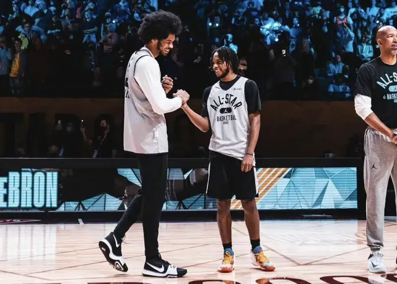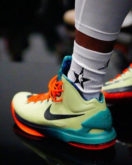 大家比较关注的莫兰特,他上脚的是KD 5 ,还真被狗哥说中了,配色选的也很有趣,是“All Star”配色,算是对杜兰特的一种致敬了。下半场,他又换了一双鞋,Air Zoom G.T. Run ,有点令狗哥意外,他没穿欧文8代,但是选了这双鞋,不过鞋子的配色很棒。