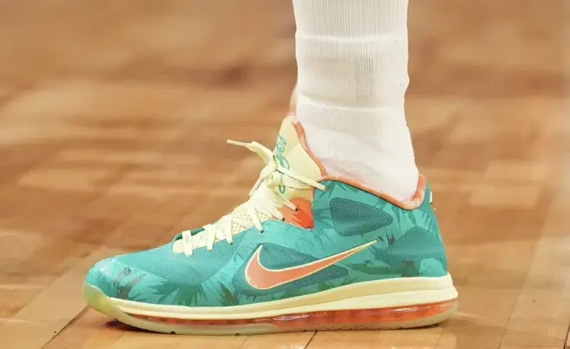 但老詹在比赛的时候,上脚的可不是这些球鞋,他先穿了一双Lebron9 Low ,全掌max气垫缓震,搭配高强度鞋面,实战性能非常强,这个配色也挺经典的,老詹全场打铁,状态有点兴奋过头了。