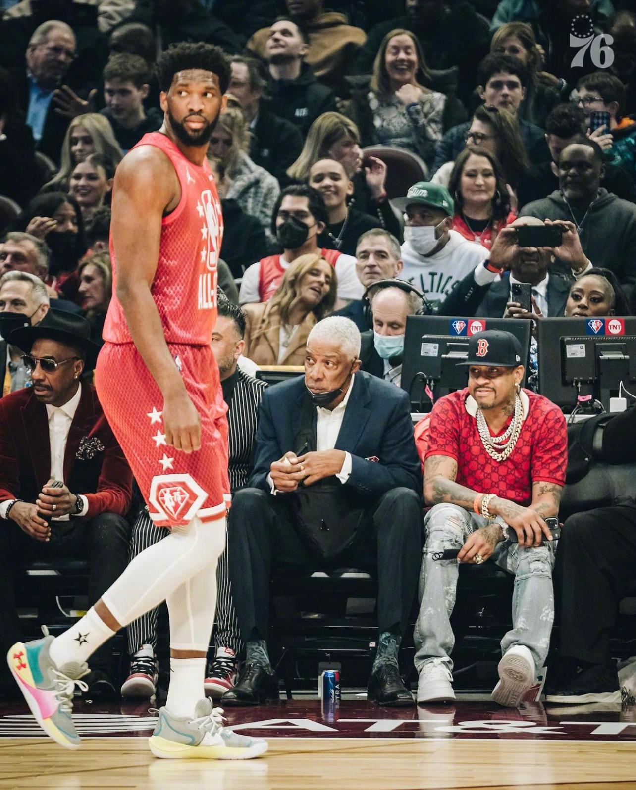 恩比德上脚的是自己的初代签名鞋,灰色鞋面配合荧光色的中底,侧面的支撑结构用粉色渐变表现,感觉还挺亮眼的,只不过他的签名鞋就出了一代,真就是中锋不卖鞋呀。