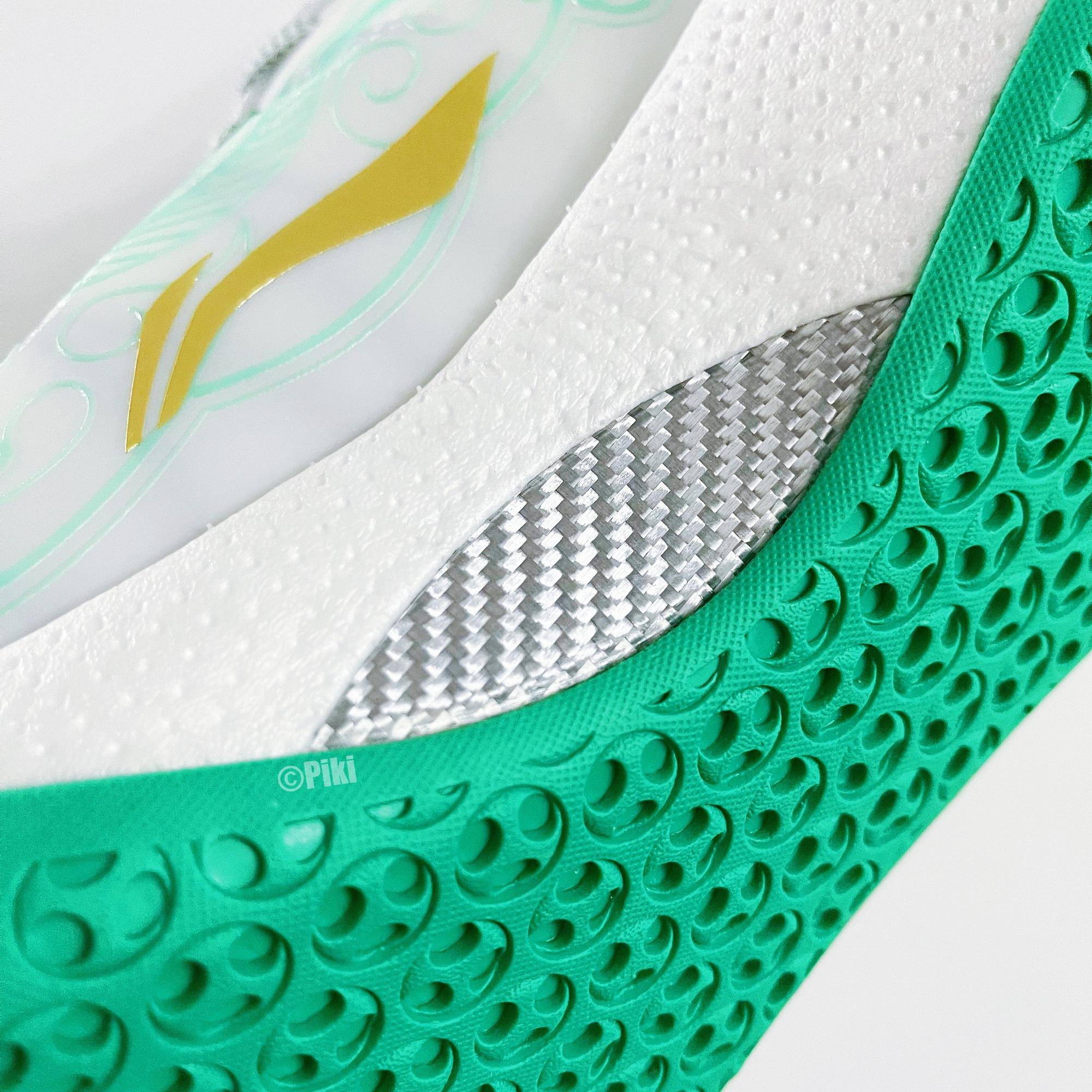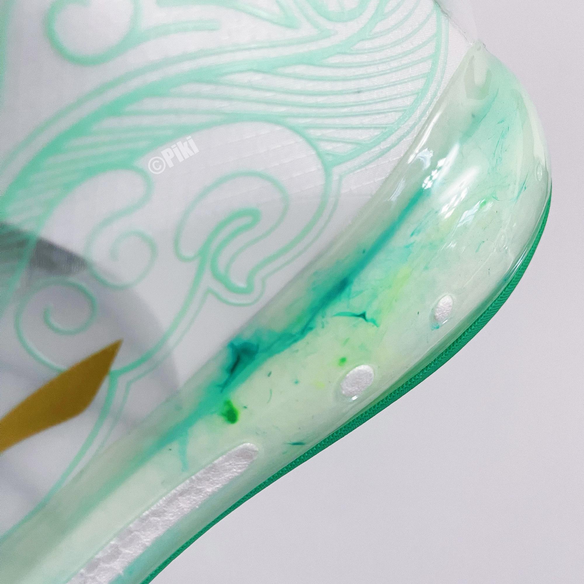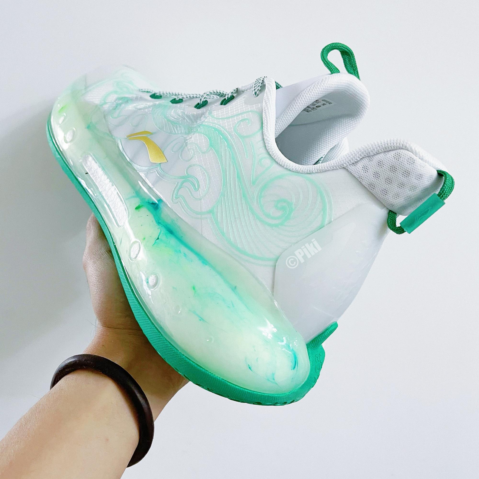 这双鞋采用白色的鞋面,细节加入绿色点缀,勾勒出复杂的线条,鞋舌位置用绿色来涂装,颇有玉石的感觉,中底外侧采用渐变的方式,通透有感觉,也是非常像玉石了,外底直接用绿色铺满,配合全明星球衣,非常亮眼。而“虎符”这个概念,象征着“调兵遣将”的权利,这股东方力量,给赛场增添了不少色彩。