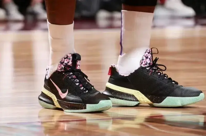 在最后时刻,老詹穿了一双“使节13”,这也是最近他穿得比较多的一双鞋了,配色方面很特别,有点椰子的感觉,黑色鞋面加上粉色勾子,还有金色的tpu,有点奢华,鞋舌的细节狗哥非常喜欢,这里用花瓣填充,外底是绿色的,感觉有荧光的效果。