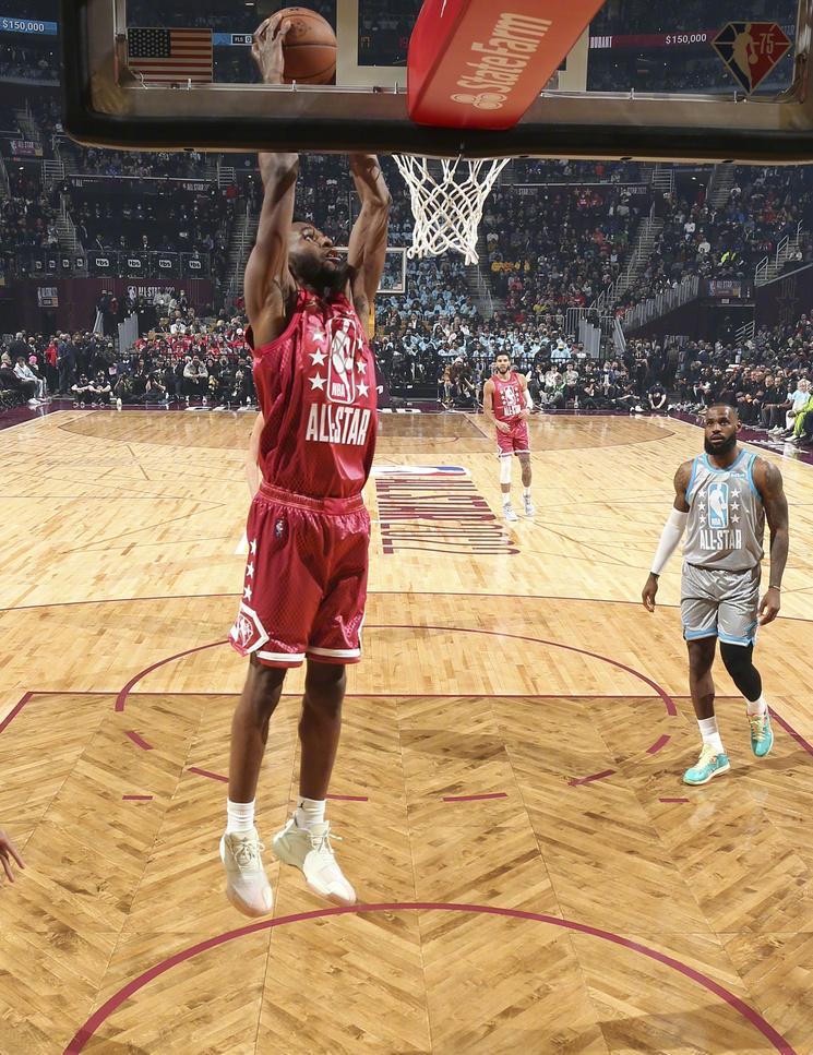 我想嘴哥也挺激动吧,第一次入选全明星,打得还挺开心的,他穿的是匹克的态极大三角,配色略显普通了,但背后的故事还挺有趣的,这个配色象征着从青涩到成熟的一种蜕变,所以采用了渐变的方式,而色彩方面,也是白色到橙色的过渡,虽然看起来低调,但与维金斯的成长经历很相符。