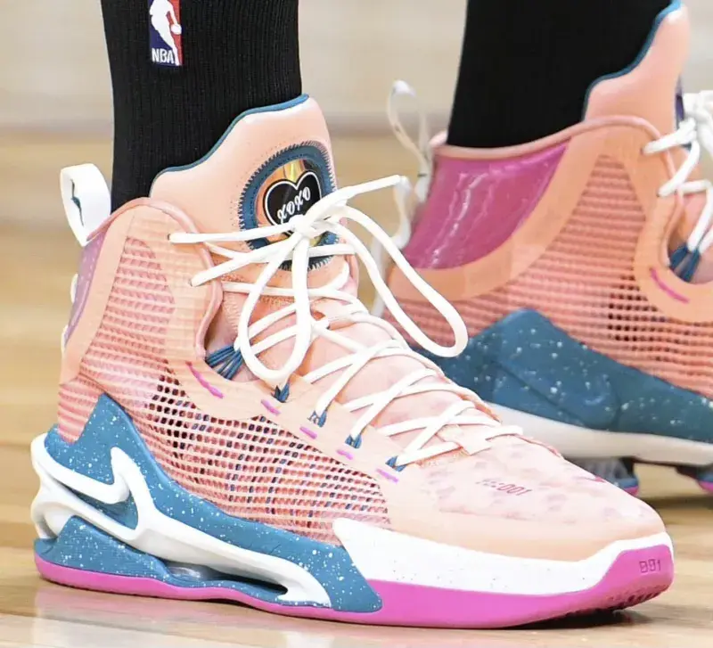 约老师穿的就是之前给他准备的 Zoom G.T. Jump ,这和狗哥之前的预测完全一样,鞋子很粉嫩,鞋面采用大面积粉色涂装,中底后跟位置用蓝色填充,上面还有白色的泼墨点缀,外底则是粉色的,鞋舌这里还有个爱心的logo,在约基奇脚下,大放光彩。