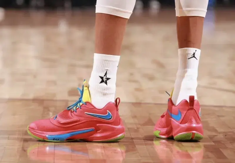 字母哥穿的是自己的第三代签名鞋,更衣室里准备的是情人节配色的 Zoom Freak 3 ,蓝色涂装,配合荧光色中底,还挺亮眼的,正式比赛的时候,他换了一个配色,这双鞋在前一天他就上脚了,也是个联名款,挺亮眼的。