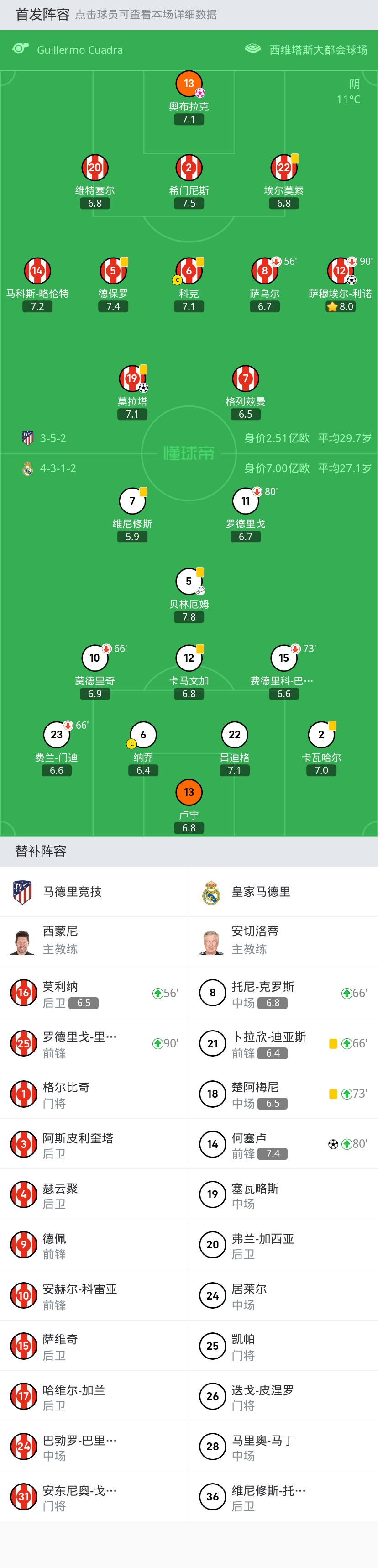 马德里竞技 首发:20-维特塞尔, 13-奥布拉克, 7-格列兹曼, 19-莫拉塔, 8-萨乌尔, 6-科克, 5-德保罗, 2-希门尼斯, 22-埃尔莫索, 14-马科斯-略伦特, 12-萨穆埃尔-利诺