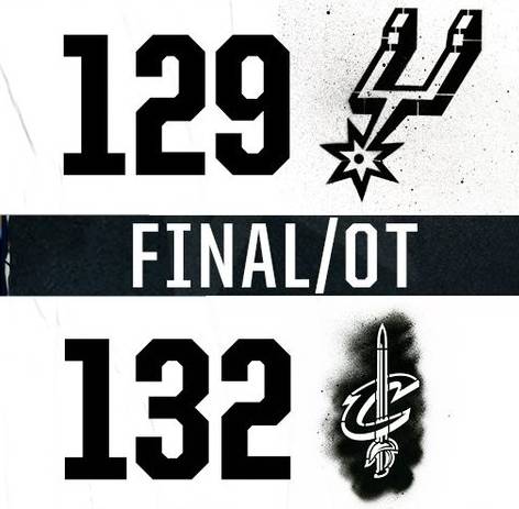 加时赛开始,各拿4分后骑士打出6-0领先6分!马刺连续投丢!终于靠盖伊罚中2球,最后17.7秒骑士领先4分,德拉维多瓦稳稳罚中2球,怀特也罚中2球回敬。奥斯曼罚中1球,怀特又飙中三分追到1分!但是塞克斯顿关键两罚仅一中,但是比赛时间结束,骑士险胜。
