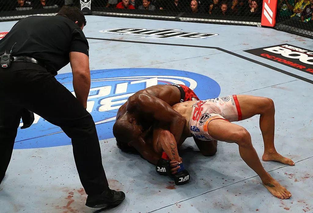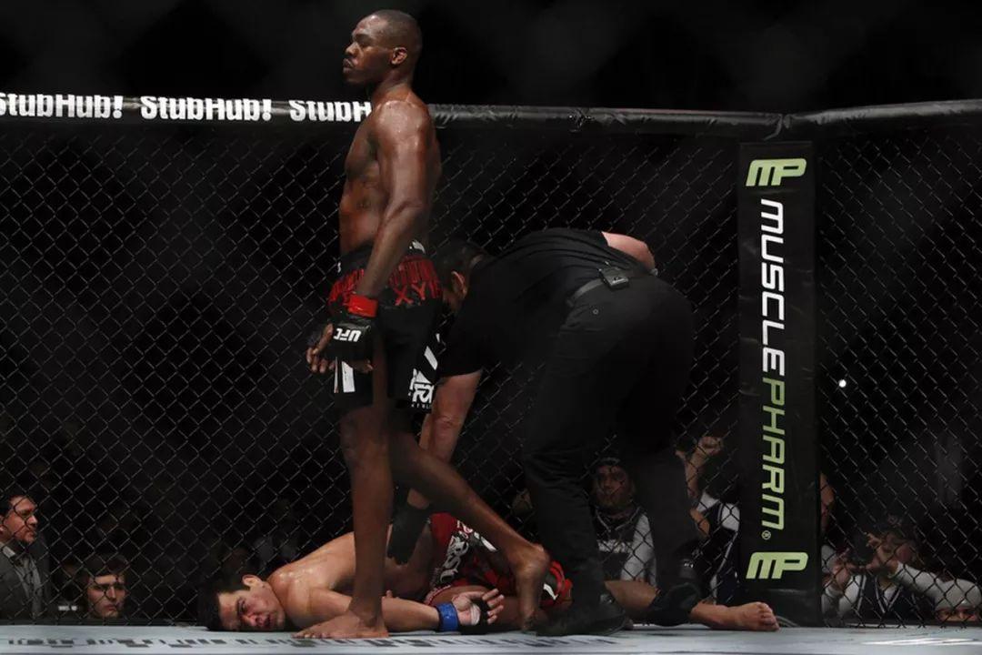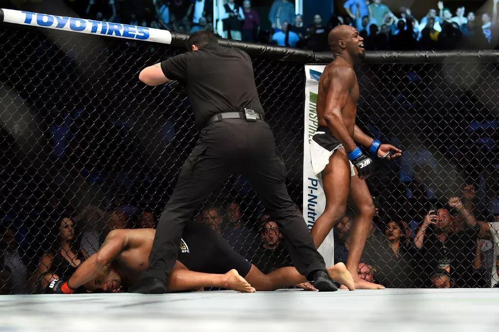 但是,到了第二回合,“骨头”一记地面砸肘,让龙太的额头血流不止,也彻底改变了比赛走向。 在第二回合结束前不到1分钟,琼斯一记后手拳,击倒前冠军,龙太奋力防守无果,最终,琼斯站立断头台绞晕龙太,再度捍卫了自己UFC轻重量级王者的身份。