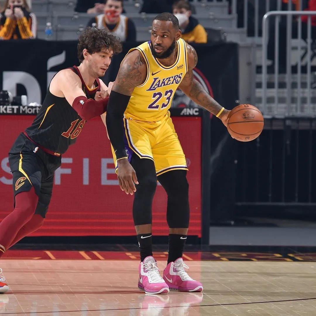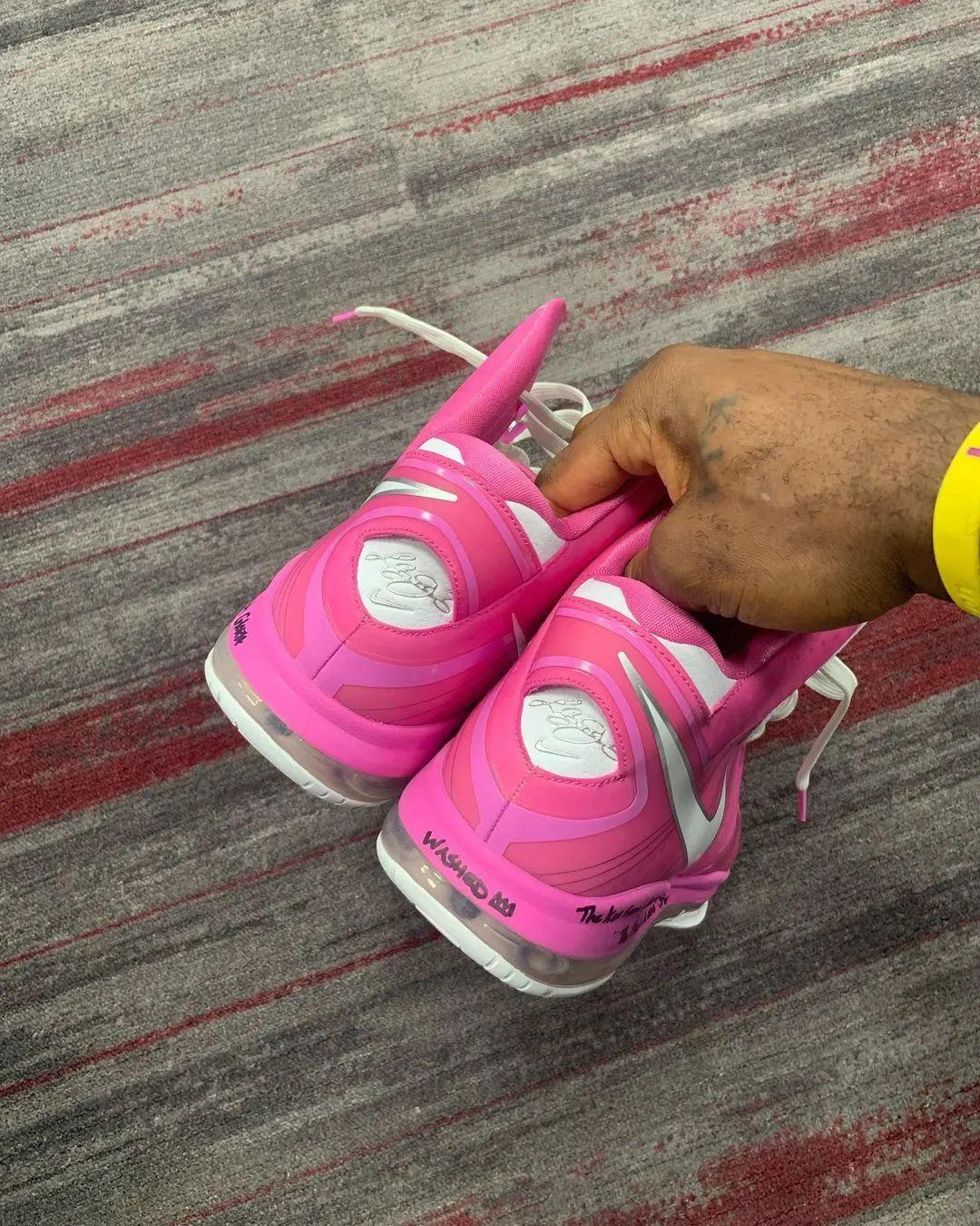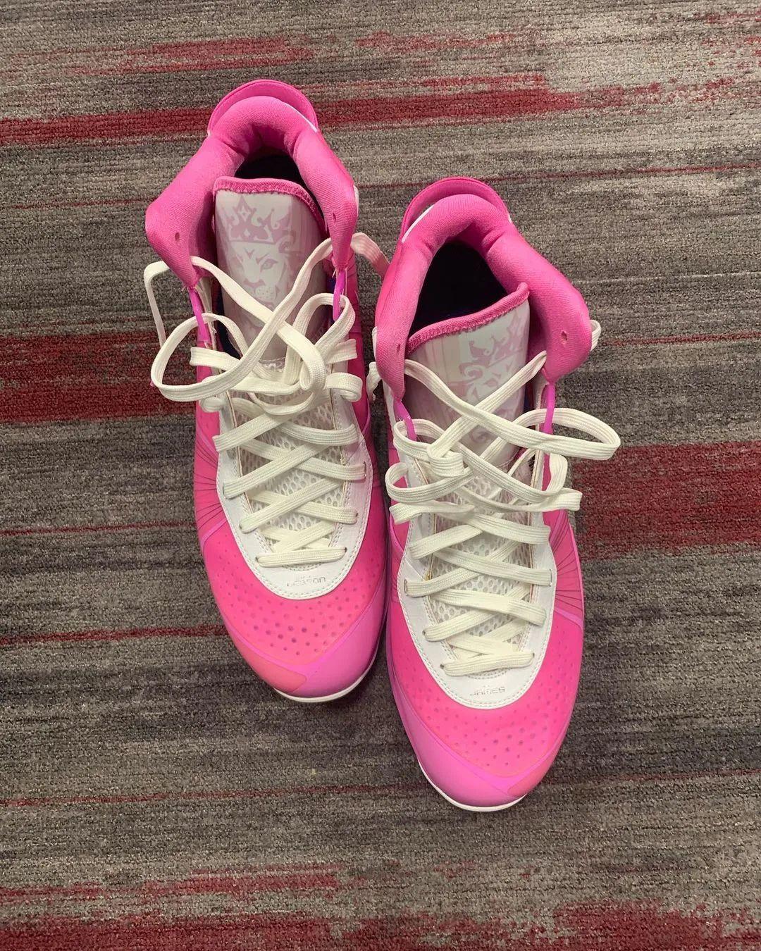 通过詹姆斯赛前晒出的实物图片可以看出,整双鞋采用大面积粉色打造鞋身,鞋带孔周围以及侧身巨大的 Swoosh Logo 则是以白色装扮,搭配白色鞋舌以及鞋带,完善整双鞋抗乳腺癌配色方案。
