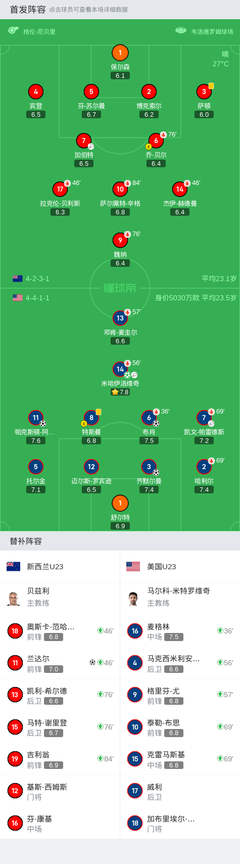 D-米哈洛维奇第10分钟首开纪录,齐默曼、布西奥破门,美国半场3球领先。下半场亚伦森建功,兰德尔为新西兰扳回一球。
