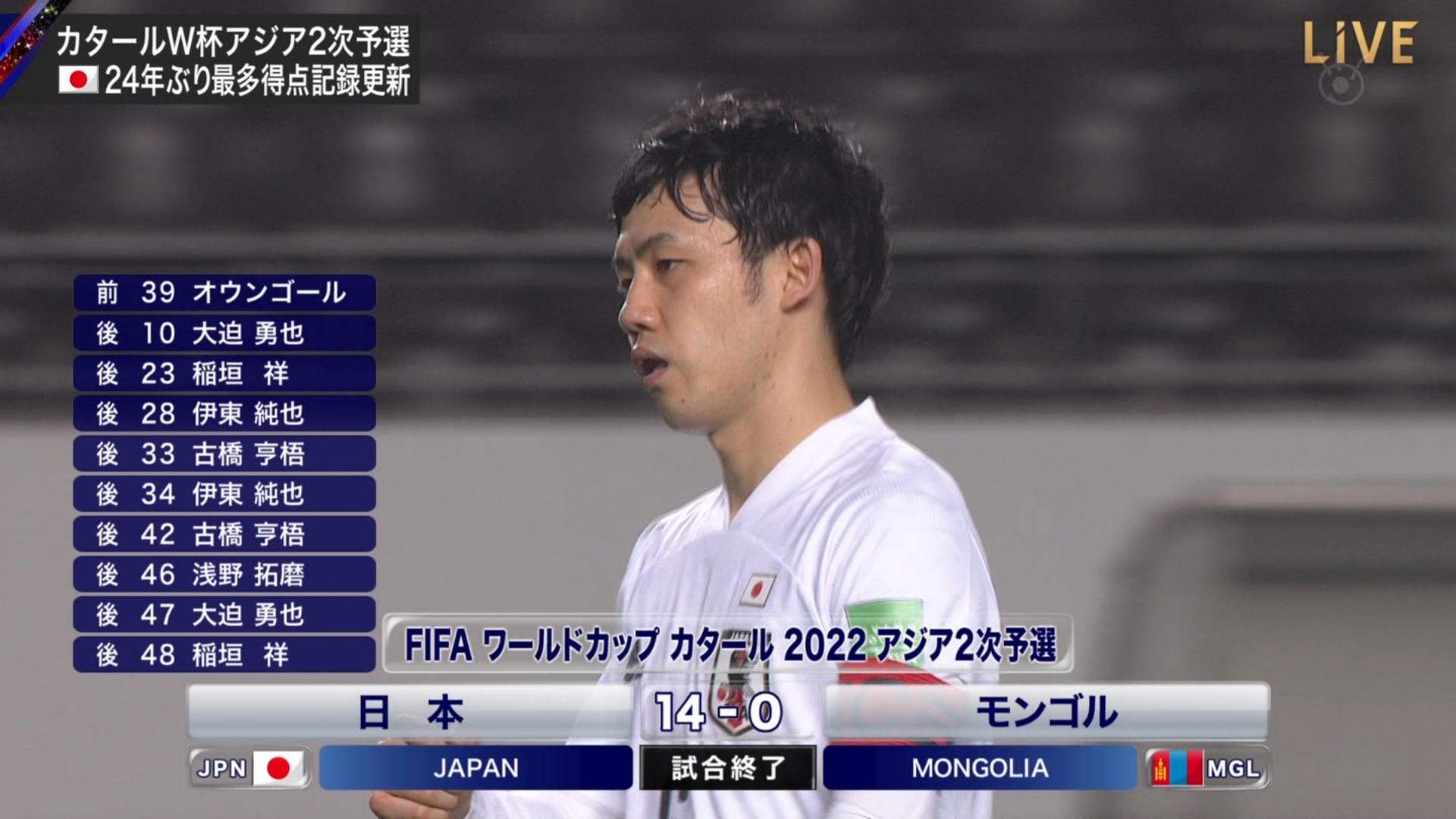 第87分钟,古桥亨梧完成梅开二度,日本队11-0蒙古。补时阶段,包括浅野拓磨、大迫勇也和稲垣祥在内连入3球,最终比分定格在14-0,日本队豪取40强赛的5连胜。