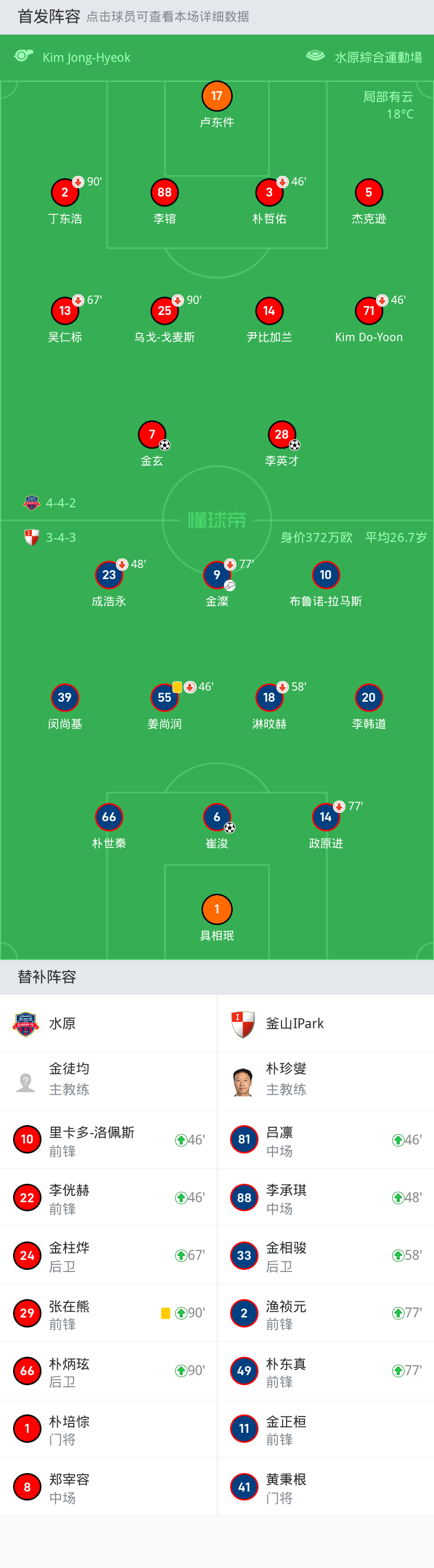 上场替补:46'10-里卡多-洛佩斯, 46'22-李侊赫, 90'66-朴炳玹, 67'24-金柱烨, 90'29-张在熊