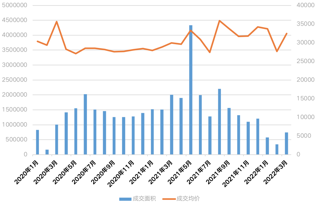 图:2020年1月-2022年3月杭州商品住宅成交量价(万平方米、元/平方米)