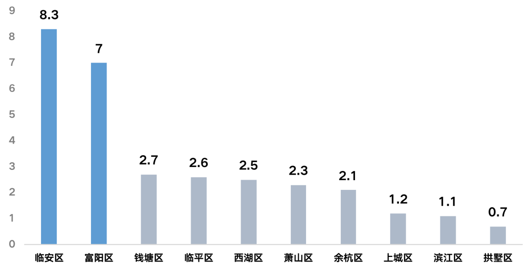 从去化来看,虽全市商品住宅去化仅为4.2个月,但临安、富阳区的商品住宅去化周期显著高于其他区域,分别为8.3个月和7个月。